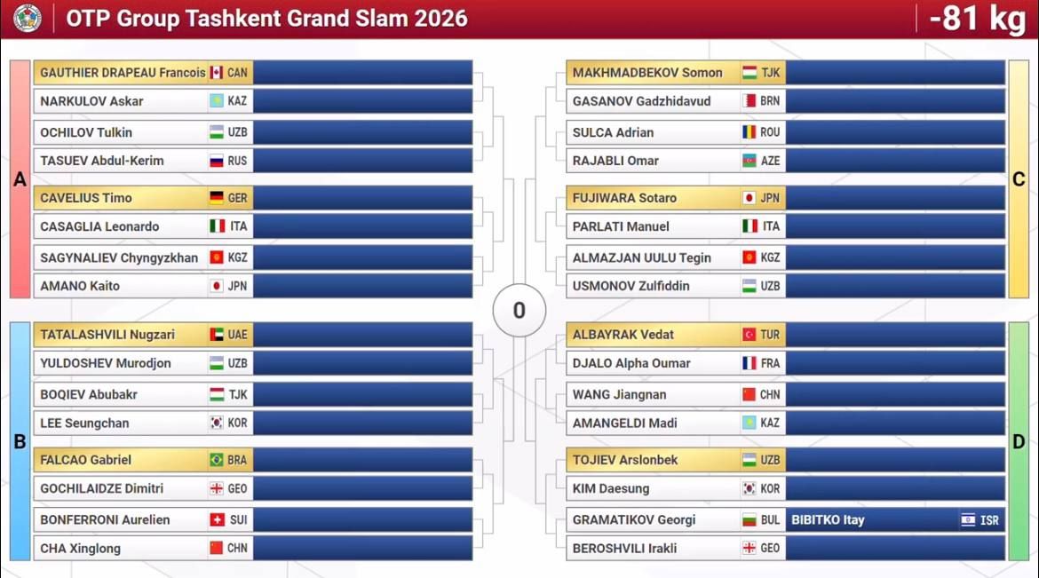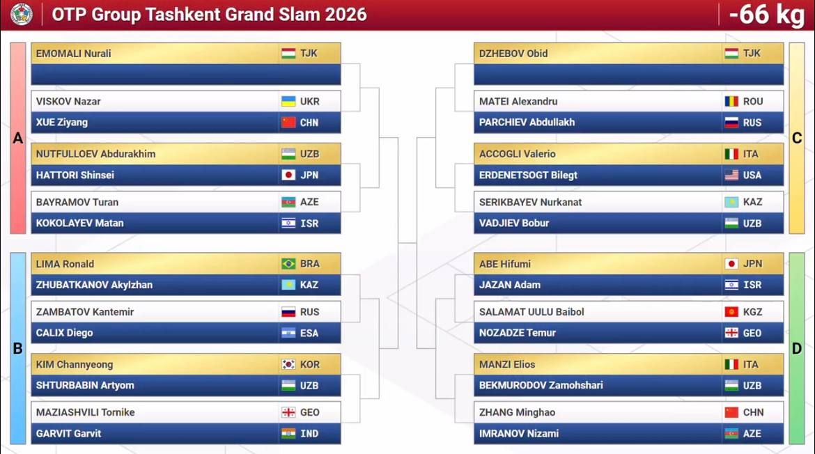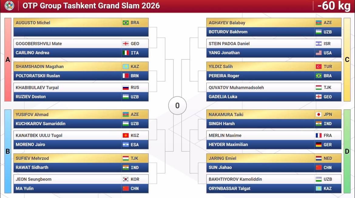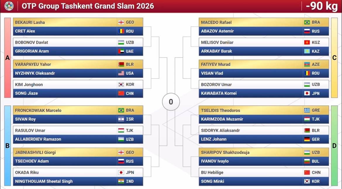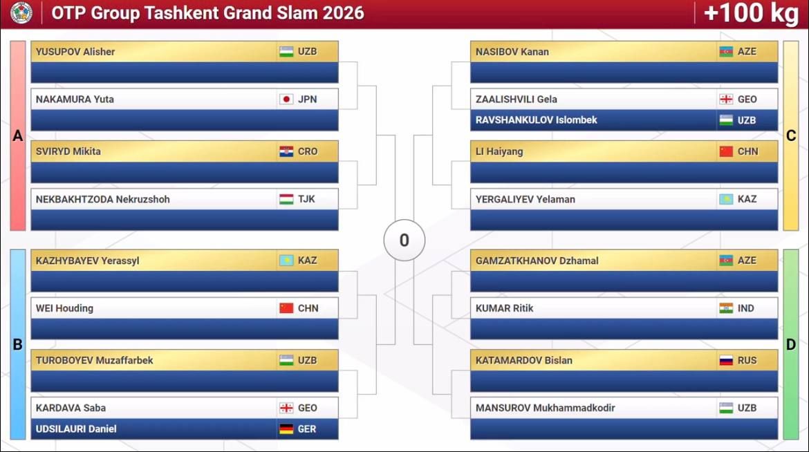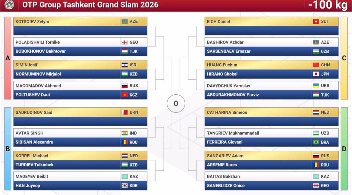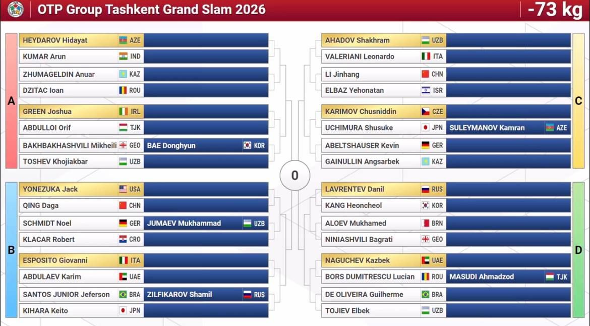Олти нафар дзюдочимиз илк даврадаёқ Япония терма жамоаси вакилларига рўбарў бўлди. Токио-2020 Олимпиадаси совриндори, жаҳон чемпиони Давлат Бобонов иккинчи даврада икки карра Олимпия ўйинлари чемпиони грузиялик Лаша Бекаури билан тўқнаш келиши мумкин. Бунинг учун Бобонов биринчи босқичда БАА вакили Арам Григорянни, Бекаури эса руминиялик Алекс Кретни мағлуб этиши лозим.