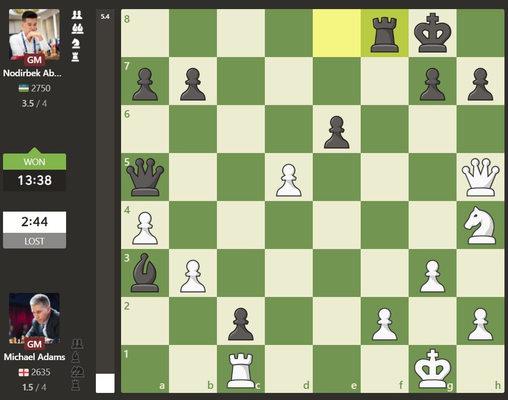 Кеча London Chess Classic 2025 турнирининг тўртинчи турида Нодирбек яна қора доналарда ўйнади. Бу сафар у Буюк Британия чемпиони, 54 ёшли тажрибали гроссмейстер Майкл Адамсни мағлубиятга учратди. Адамс бунгача учта турда дуранг натижа қайд этиб, турнир жадвалида 1,5 очко билан 4-ўринни банд этиб турган эди.