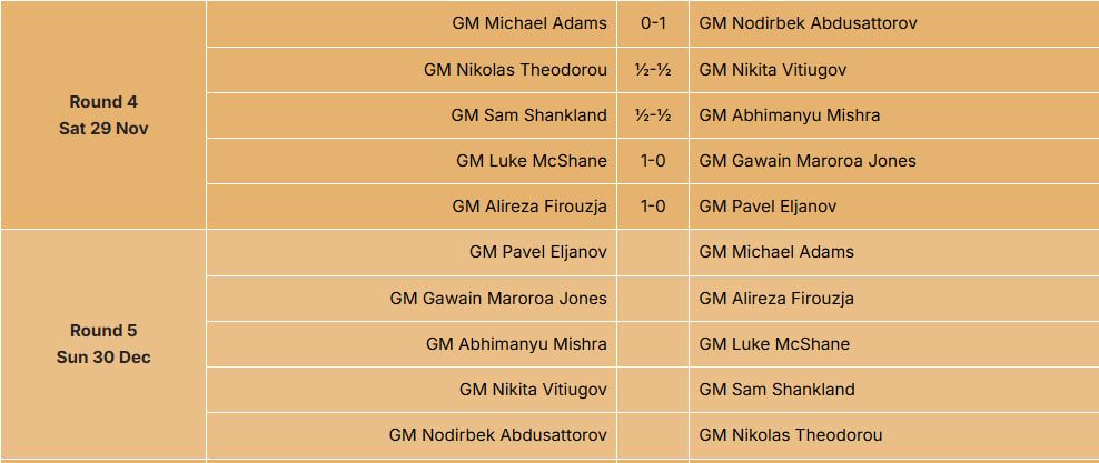 Турнирда биринчи рақам остида таснифланган франциялик Алиреза Фирузджа бу турда ғалаба қозонишга муваффақ бўлди. У оқ доналаларда украиналик гроссмейстер Павел Эльяновдан устун келди. Грециялик Николас Теодору эса Никита Витюгов билан муросага келди. Бугун Абдусатторов 5-турда айнан Теодоруга қарши оқ доналарда ўйнайди.