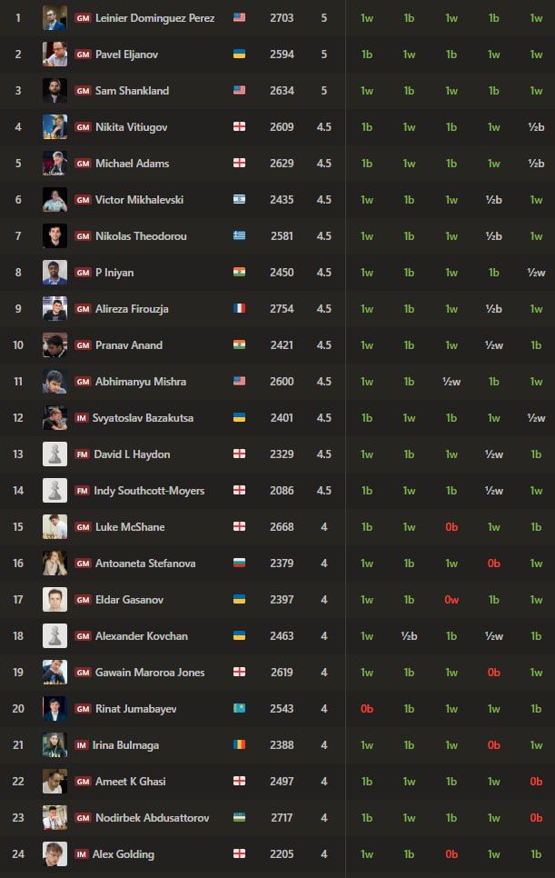 Бугун турнирда яна 5 та тур партиялари ўйналади. Ҳозирча Нодирбек 5 имкониятдан 4 очко жамғариб, қўшимча кўрсаткичларга кўра 23-поғонадан жой олган. Америкалик Леньер Домингес Перез, украиналик Павел Эльянов ва яна бир АҚШ вакили Сэм Шанклэнд юз фоизлик кўрсаткич, яъни 5 очко билан турнир жадвалида пешқадамлик қиляпти. Ўн бир нафар шахматчи ҳисобида 4,5 очкодан бор.