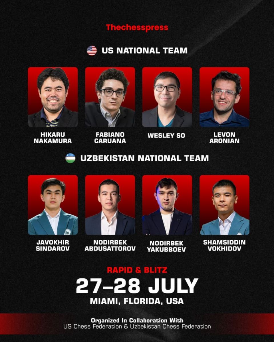 27-28 июль кунлари Флорида штати Майами шаҳрида Ўзбекистон ва АҚШ шахмат федерациялари ҳамкорлигида юқори даражадаги рапид ва блиц учрашуви бўлиб ўтади.