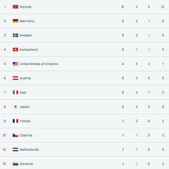 Медаллар жамғариш рейтингида пешқадам бўлиб турган Норвегия делегацияси кун давомида яна 3 та олтин, 1 та кумуш ҳамда 2 та бронза медалларига эга чиқди ва ўз пешқадамлигини мустаҳкамлаб олди.