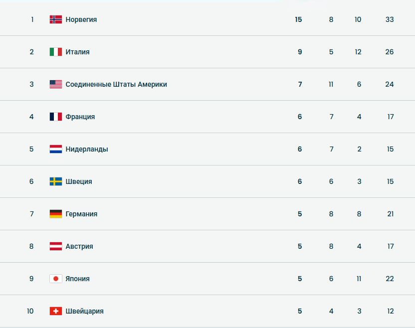 Оқ Олимпиаданинг навбатдаги кунги беллашувлари медаллар жамғариш рейтингининг Топ-10`талигига катта таъсир ўтказмади. Норвегия спорт делегацияси 15 та олтин, 8 та кумуш, 10 та бронза, жами 33 та медаль билан пешқадамликни давом эттирмоқда. Италия терма жамоасининг умумий медаллар сони 26 тага етди. Мезбонлар 9 та олтин, 5 та кумуш, 12 та бронза медали билан иккинчи ўринни банд этишган. Кучли учликка АҚШ (7 та олтин, 11 та кумуш, 6 та бронза) терма жамоаси якун ясаган.