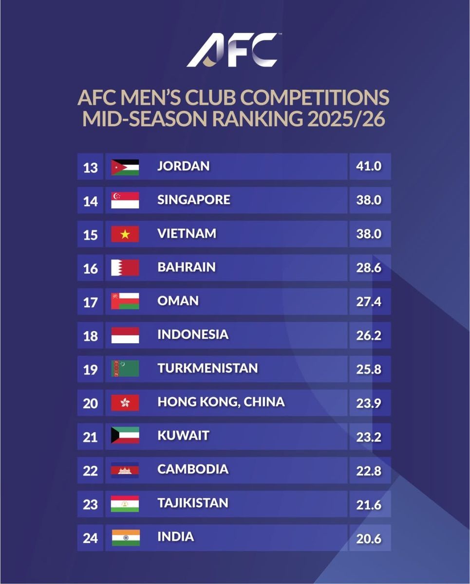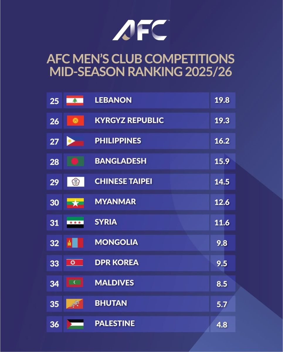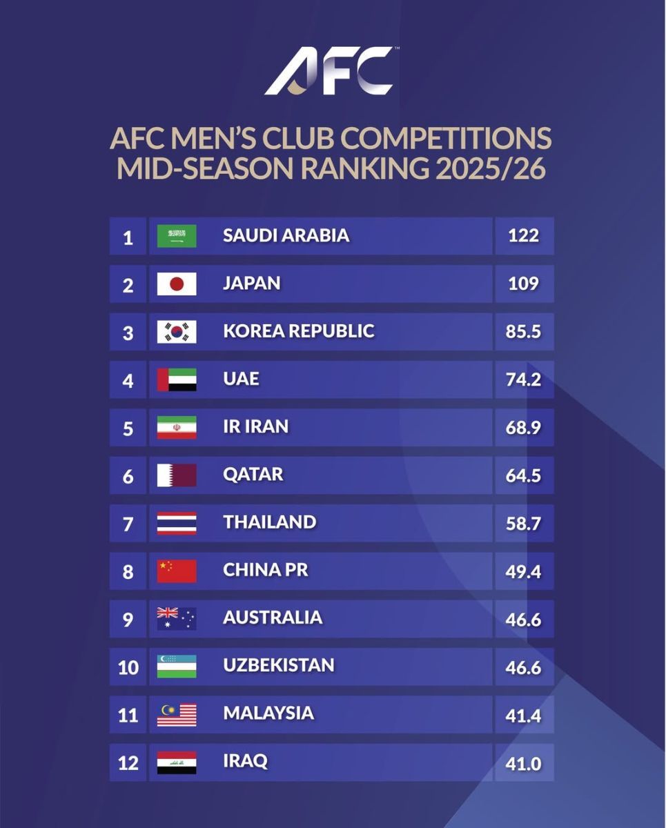 Янгиланган рейтингда Ўзбекистон 46.6 балл билан 10-ўринни банд этган. Эътиборлиси, 9-поғонада бораётган Австралия ҳисобида ҳам айнан 46.6 балл мавжуд. Вакилларимизнинг халқаро майдондаги, хусусан, "Нефтчи" ва "Пахтакор"нинг турнирларидаги иштироки келгусида бу кўрсаткични янада яхшилашга хизмат қилиши мумкин.