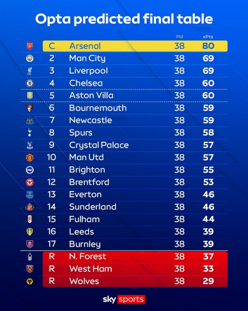 Суперкомпютер Opta АПЛнинг якуний жадвалида бўйича ўз тахминларини эълон қилди.