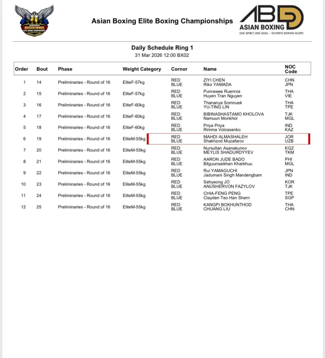 -55 кг вазндаги боксчимиз иорданиялик Маҳди Алмашалеҳ билан баҳс олиб боради. Жанг Тошкент вақти билан 10:15 да старт олади.