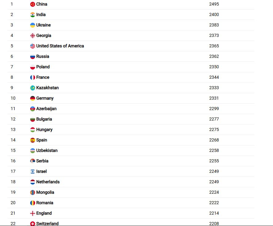 Янгиланган рейтингда АҚШ терма жамоаси пешқадамлик қилмоқда. Ҳиндистон иккинчи, Хитой шахматчилари эса учинчи ўринни эгаллаб турибди.