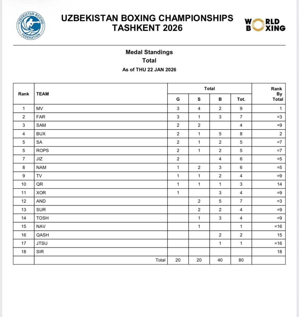 Фарғоналиклар 3 та олтин, 1 та кумуш ва 3 та бронза медалига эга чиққан бўлса, Самарқанд жамоаси 2 та олтин ва 2 та кумуш билан кучли учликни якунлаб берди.