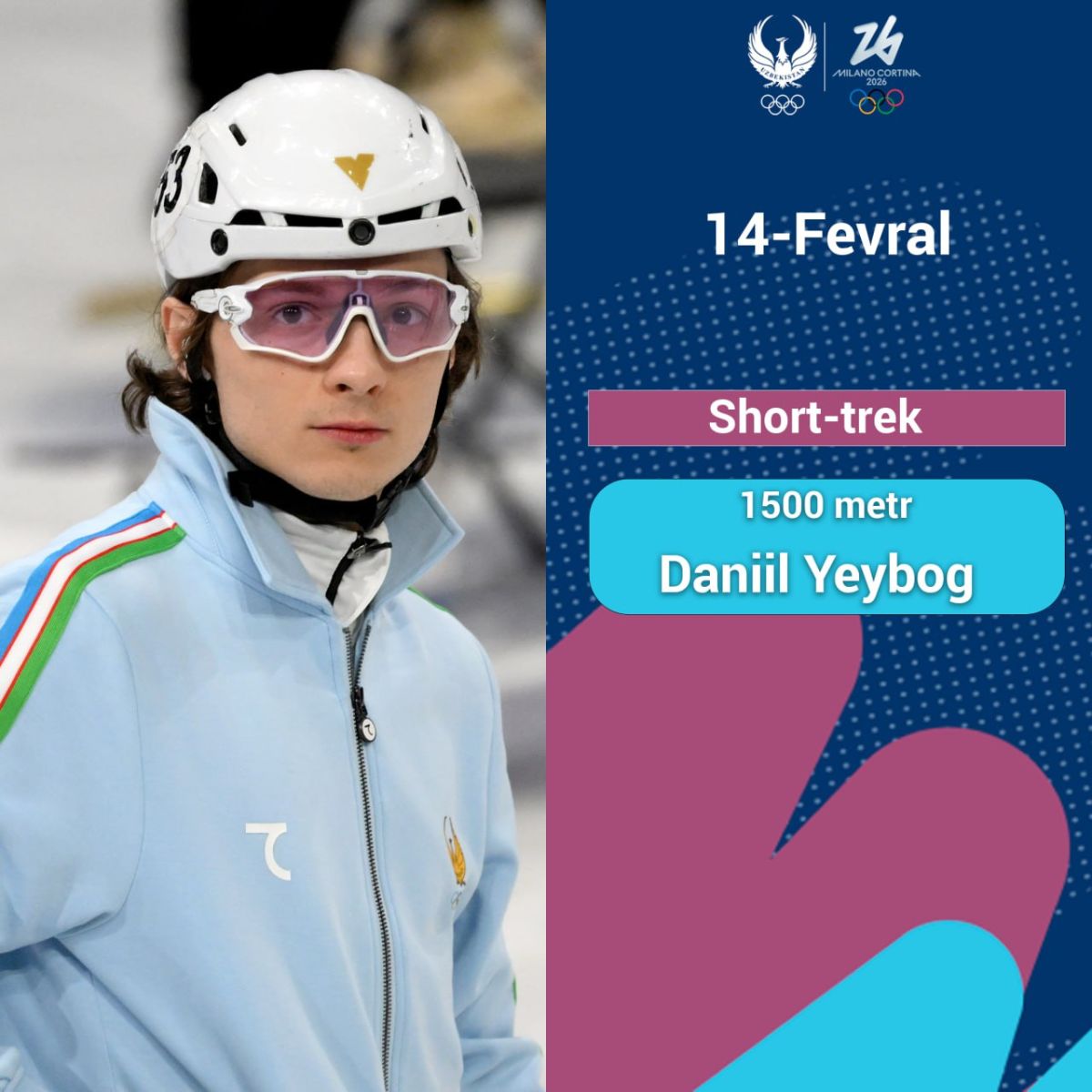 Шорт-трекчи Даниил Ейбог эса 14 февралдан 15 февралга ўтар кечаси, аниқроғи, 00:15 да 1500 м масофага кечувчи пойга чорак финалида чиқиш қилади.