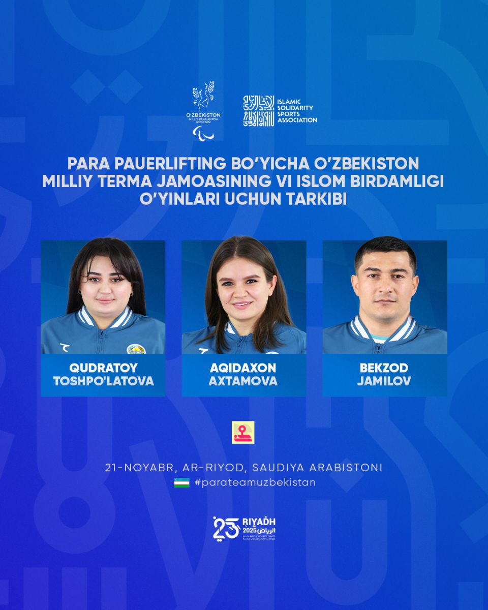 Ўзбекистон пара пауэрлифтинг миллий терма жамоаси Ар-Риёд шаҳри (Саудия Арабистони) мезбонлик қилаётган VI Ислом бирдамлиги ўйинларида қатнашади.