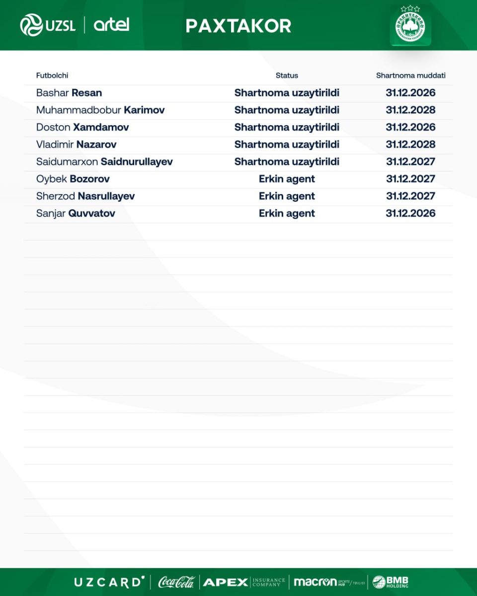 "Пахтакор" Башар Ресан ва Достон Ҳамдамов билан шатномани мавсум охиригача узайтирган бўлса, Саидумархон Саиднуруллаев 2027 йилнинг сўнгига қадар "шерлар" сафида тўп тепади. Шунингдек, Владимир Назаров ва Муҳаммодбобур Каримов билан битим 2028 йилнинг охиригача тузилди.