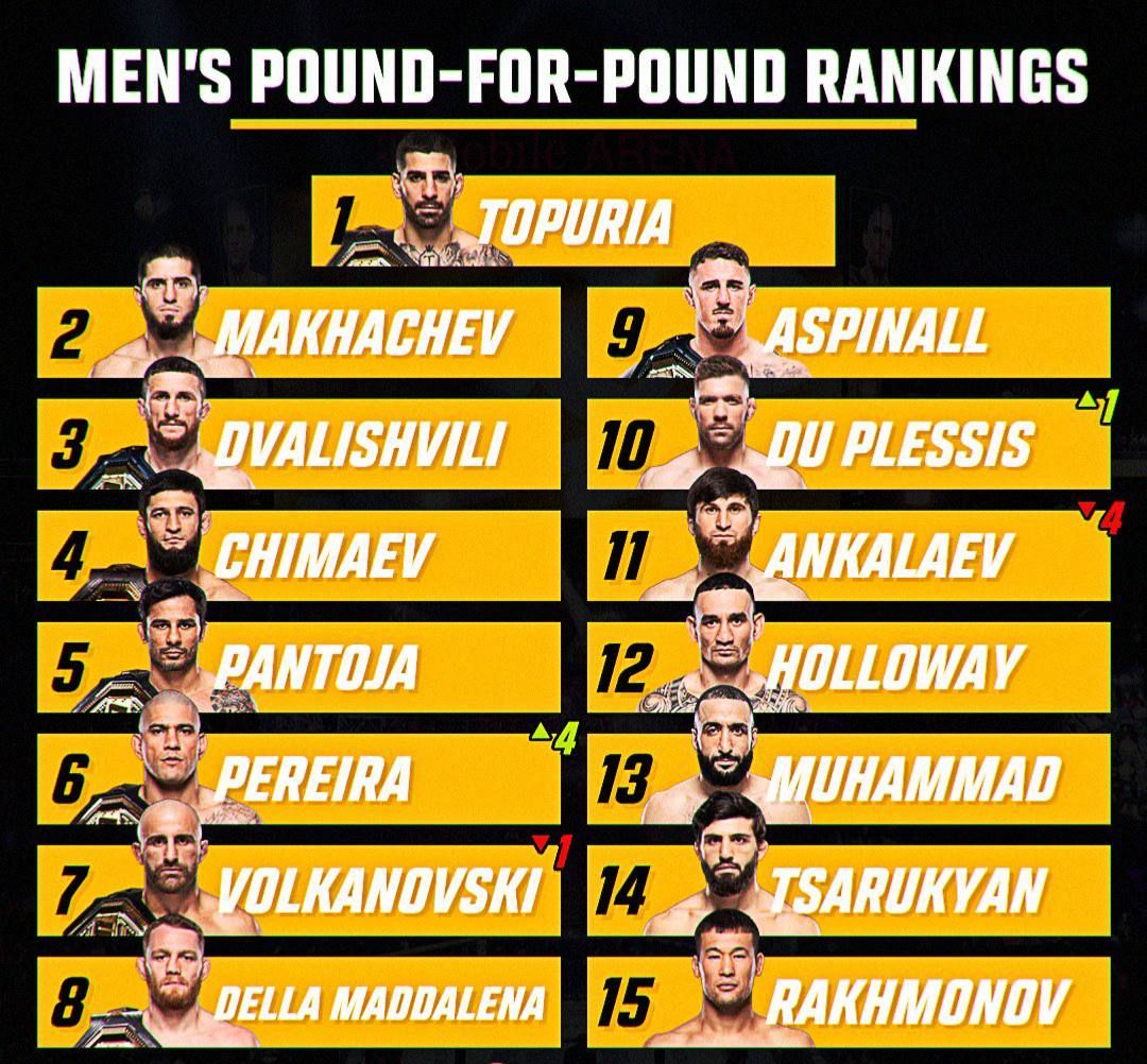 Бир неча кун олдин Магомед Анкалаевни нокаутга учратиб, чемпионлик камарини қайтариб олган Алекс Перейра тўрт поғона юқорилади ва 6-ўринга чиқиб олди.