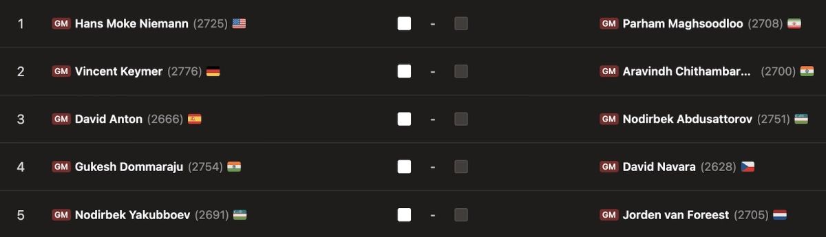 Тўртинчи турда Нодирбек Абдусатторов қора доналарда испаниялик Давид Антонга, Нодирбек Якуббоев эса оқ доналарда нидерландиялик Йорден ван Форестга қарши ўйнайди.