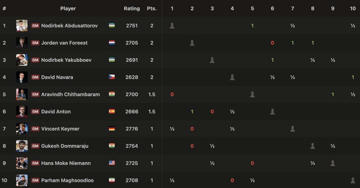 Учинчи турдан сўнг турнир жадвалида Нодирбек Абдусатторов 2 очко билан қўшимча кўрсаткичларга кўра пешқадамлигини сақлаб қолди. Икки очкога эга Нодирбек Якуббоев эса учинчи ўринни банд этган. Йорден ван Форест кечаги ғалабаси эвазига икки очко билан қўшимча коэфицентларга кўра иккинчи ўринга кўтарилиб олди.