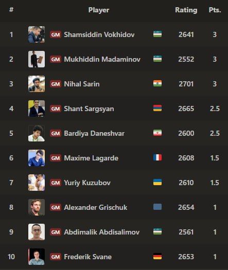 Президент Кубогининг 4-туридан кейин Шамсиддин Воҳидов, Муҳиддин Мадаминов ва Ниҳал Сарин 3 очкодан жамғариб, турнир жадвалида қўшҳокимлик қилишяпти. Қўшимча коэфицентларга кўра Шамсиддин ҳамда Муҳиддин биринчи ва иккинчи ўринларни банд этган.