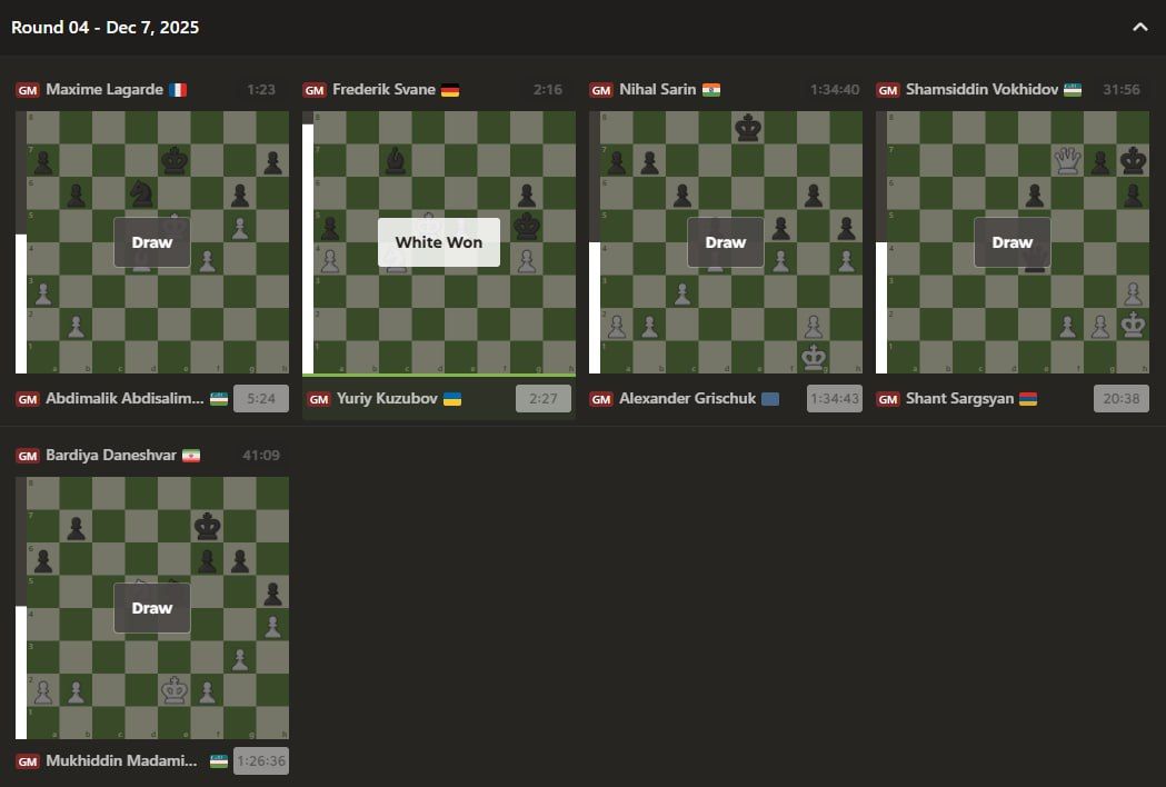 Тўртинчи турнинг қолган барча партияларида томонлар муросага келишди. Мусобақада бешинчи рақам остида сараланган ҳамюртимиз Шамсиддин Воҳидов (2641) рейтингда ўзидан юқорида бораётган арманистонлик Шант Саргсян билан муросага келди. Гроссмейстеримиз Абдималик Абдисалимов (2561) ҳам ўзидан юқорида турган франциялик Максим Лагарде (2608 ) билан дуранг натижа қайд этди. Яна бир ёш гроссмейстеримиз Муҳиддин Мадаминов (2552) эронлик рақиби Данешвар Бардия (2600) билан дуранг ўйнади.
