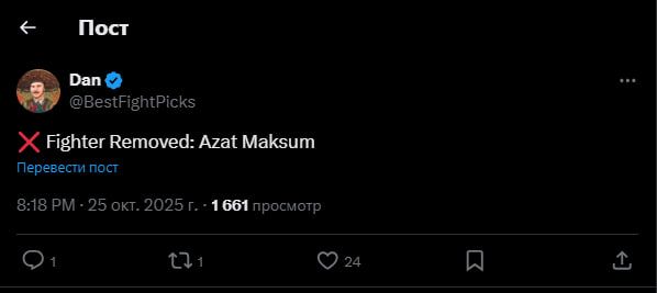 "Жангчи ростердан чиқарилди: Азат Максум", — дея ўзиниг X (собиқ Twitter) ижтимоий тармоқдаги саҳифасида хабар қолдирган Леви.