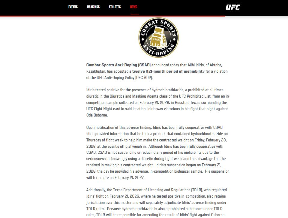 Алиби Идирис бир йилга - 2027 йил 21 февралгача дисквалификация қилинди. Бу ҳақда UFC расмий сайтида хабар берилди. Спортнинг жанговар турлари бўйича допингга қарши кураш хизмати (CSAD) Идриснинг 21 февралдаги намунасида тақиқланган диуретик гидрохлортиазидни аниқлади. Ўша куни у Хьюстондаги UFC Fight Night турнирида Оде Осборнни мағлуб этганди.