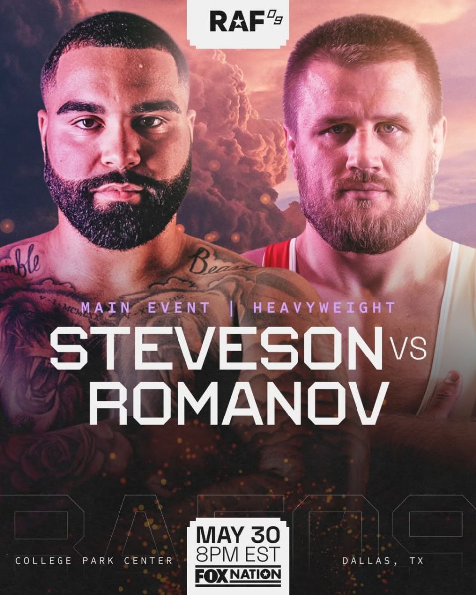 Унга кўра, эркин кураш бўйича 125 кг вазн тоифасида Токио-2020 Олимпиадаси ғолиби бўлган америкалик Гейбл Стивсон RAF 9 мусобақасининг асосий баҳсида UFC собиқ вакили, Молдовия вакили Александр Романов билан тўқнаш келади. Жанг оғир вазн тоифасида бўлиб ўтади.