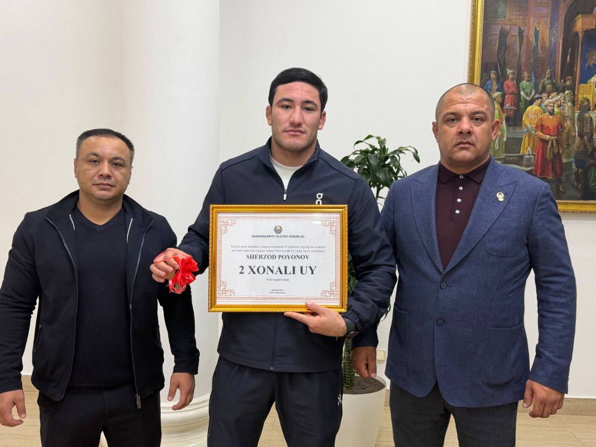 Қашқадарё вилояти ҳокими Муротжон Азимов Шерзод Поёновга ушбу натижалари ортидан Қарши шаҳридан икки хонали уй совға қилди.