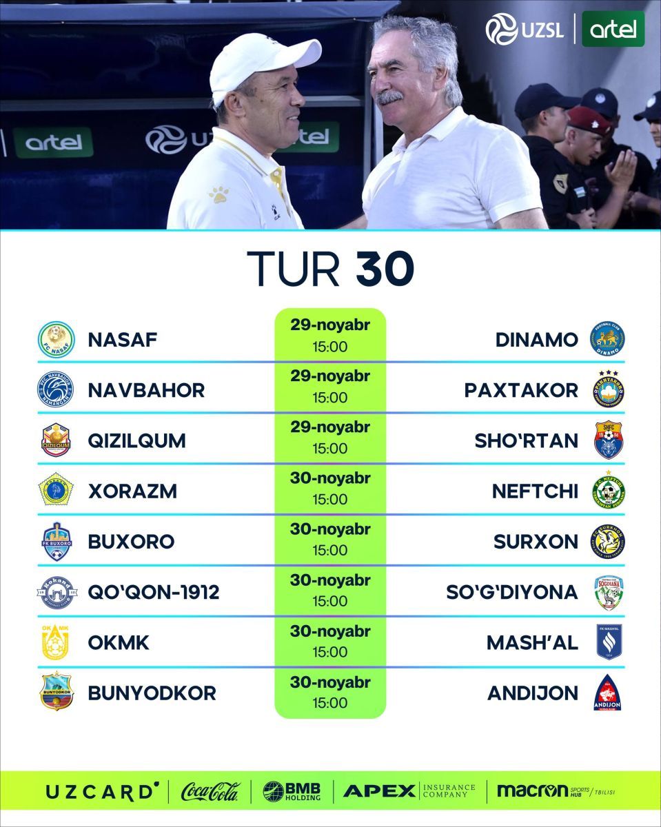 29 ноябрь куни мамлакат Суперлигаси сўнгги тур баҳсларига старт берилади.