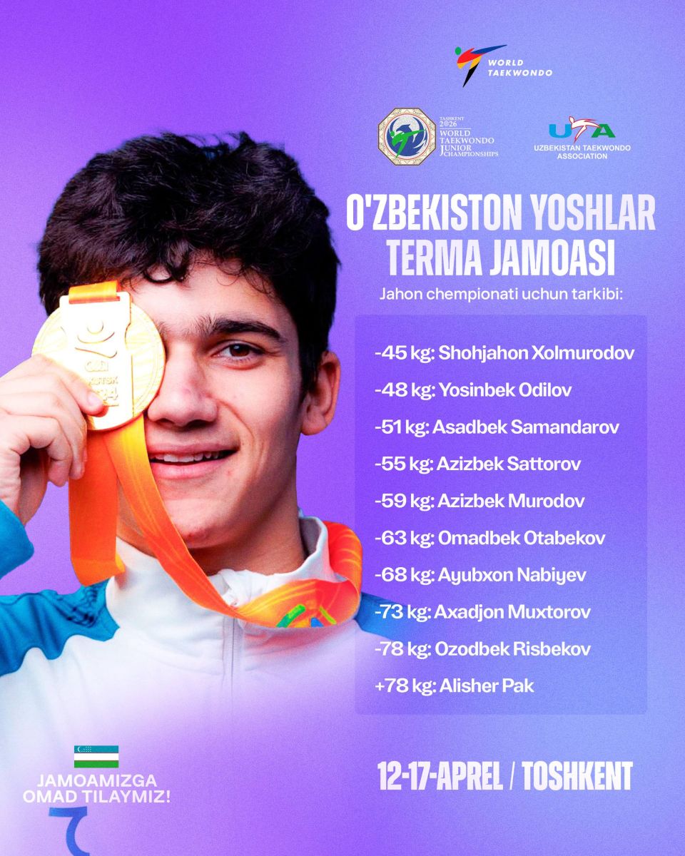 Таэквондо бўйича ёшлар терма жамоамизнинг Тошкент мезбонлик қиладиган Жаҳон чемпионати учун таркиби эълон қилинди