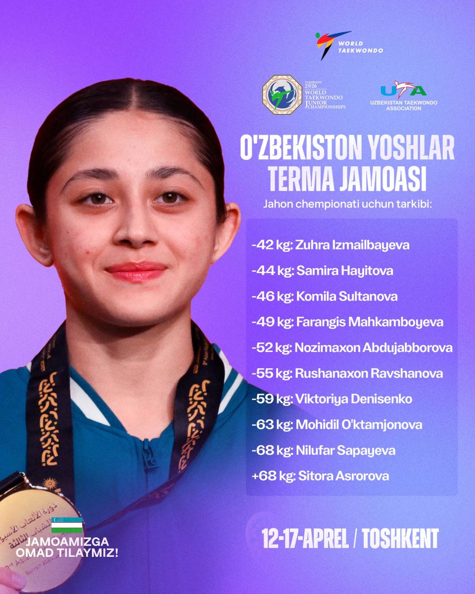 Мураббийлар штаби қарорига кўра, Жаҳон чемпионатида қуйидаги ёш таэквондочиларимиз юртимиз шарафини ҳимоя қилади:
