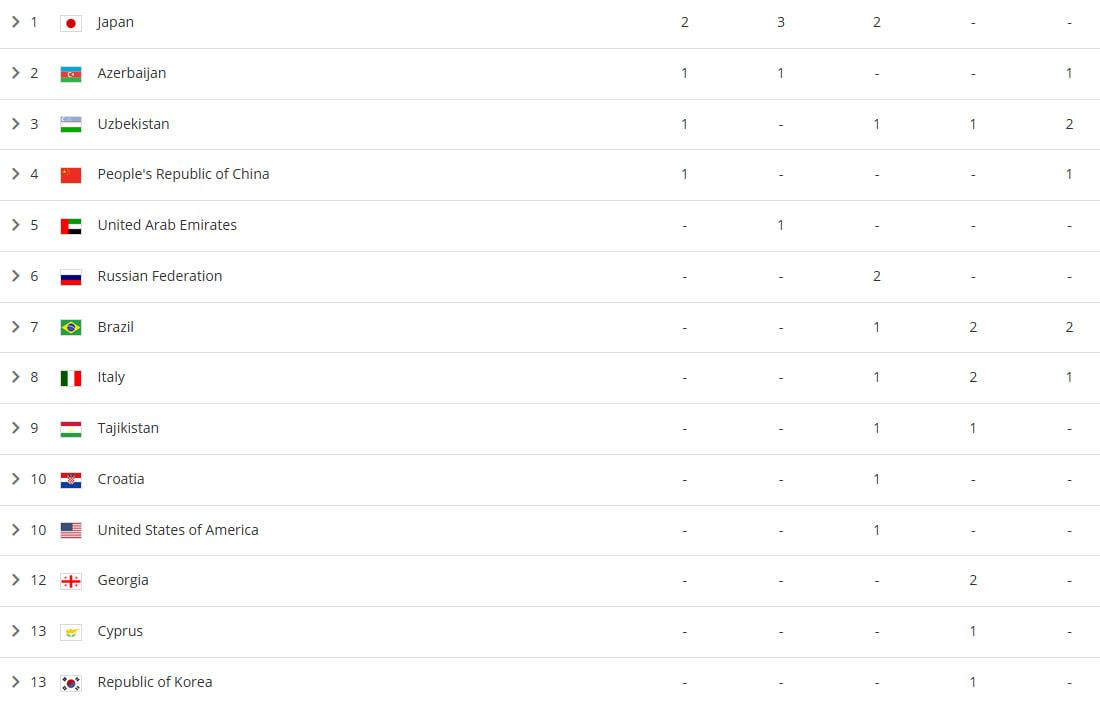 Шу тариқа, Ўзбекистон терма жамоаси мусобақанинг биринчи кунги баҳслари натижаларига кўра, 1 та олтин ва 1 та бронза медали билан 39 давлат орасида фахрли 3-ўринни эгаллаб турибди. Япония терма жамоаси 2 та олтин, 3 та кумуш, 2 та бронза медали билан пешқадамлик қилаётган бўлса, 1 та олтин ва 1 та кумуш медалига эга Озарбайжон иккинчи поғонани банд этган.