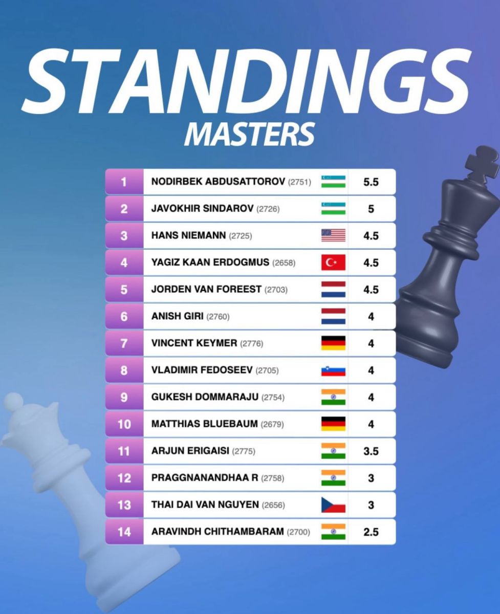 Турнирнинг кучлилар жам бўлган "Мастерс" гуруҳида дунёнинг етакчи 14 гроссмейстери қаторида ҳамюртларимиз Нодирбек Абдусатторов ва Жавоҳир Синдаров ҳам бош соврин учун баҳс олиб боряпти. Бугунги тур олдидан Нодирбек 5,5 очко билан биринчи, 5 очкога эга Жавоҳир эса иккинчи ўринни эгаллаб турибди.