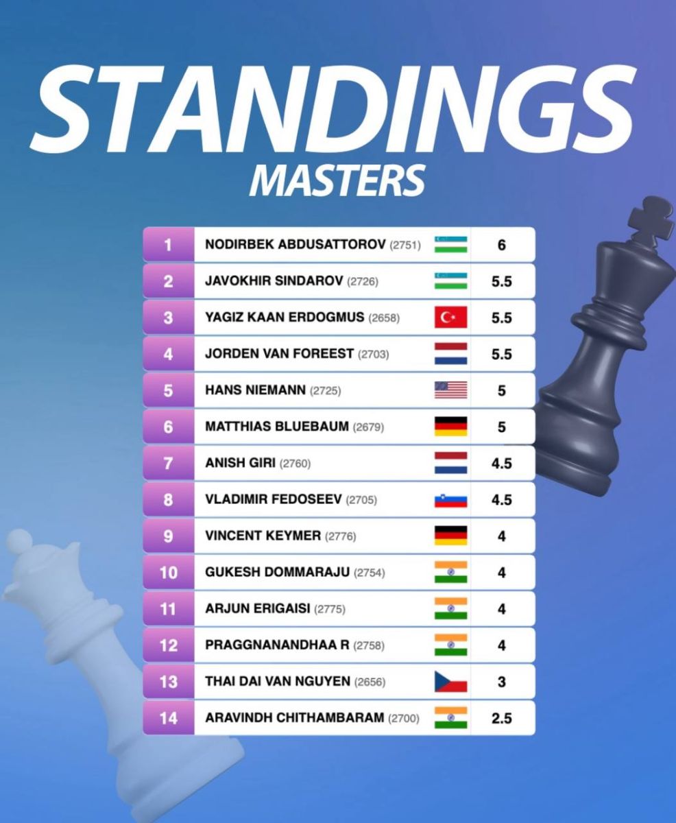 Турнирнинг кучлилар жам бўлган "Мастерс" гуруҳида дунёнинг етакчи 14 гроссмейстери қаторида ҳамюртларимиз Нодирбек Абдусатторов ва Жавоҳир Синдаров ҳам бош соврин учун баҳс олиб боряпти. Кечаги тур олдидан Нодирбек 5,5 очко билан биринчи, 5 очкога эга Жавоҳир иккинчи ўринни эгаллаб турганди.