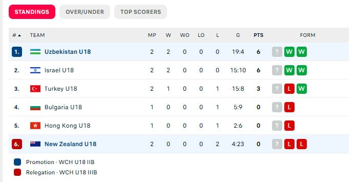 Гуруҳда Ўзбекистон ва Исроил терма жамоалари 6 тадан очко жамғариб, қўшҳокимлик қилишяпти. Энди 5 март куни ёш хоккейчиларимиз Туркияга қарши музга чиқишади.