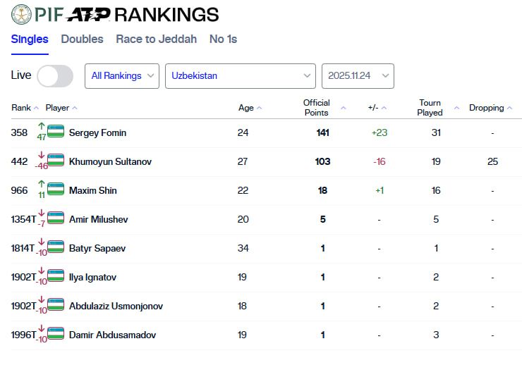 Учинчи ракеткамиз Максим Шин 11 поғонага юқорилаб, 966-ўринга жойлашди. Қолган барча теннисчиларимиз янгиланган рейтингда пастлашди. Амир Милушев 7, Батир Сапаев, Илья Игнатов, Абдулазиз Усмонжонов ва Дамир Абдусаломов бир хилда - 10 поғонадан пастлашди.