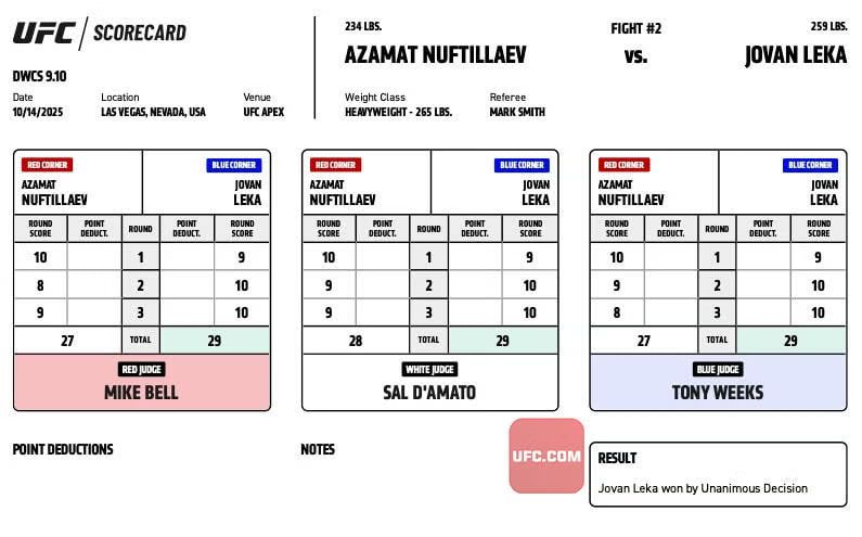 UFC шартномалари ўйналган мазкур турнирда оғир вазн тоифасидаги аралаш яккакураш устамиз Азамат Нуфтиллаев сербиялик Йован Лекага қарши октагонга чиқди. Жанг тўлиқ уч раунд давом этди ва унинг якунида Лека ҳакамларнинг якдил қарори билан очколар (29:27, 29:28, 29:27) ҳисобига кўра ғалаба қозониб, дунёнинг энг кучли лигаси жангчисига айланди.