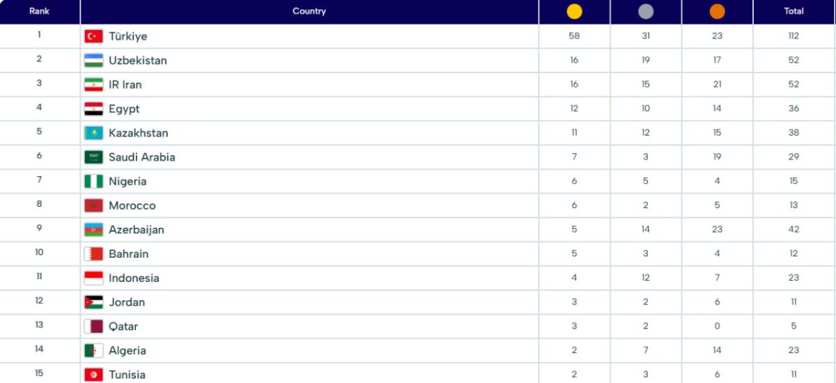 Ўзбекистон спорт делегацияси ҳам Эронда бўлгани сингари жами 52 та медаль бор. Шундан 16 таси олтин, 19 таси кумуш, 17 таси бронза медалларидир. Кумуш медаллар кўплиги ҳисобига 2-ўринни сақлаб қолдик. Кучли бешликдан Миср ва Қозоғистон терма жамоалари жой олган.