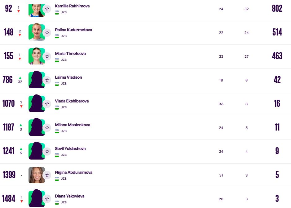 Янгиланган рейтингда Россиядан маҳаллийлаштирилган уччала теннисчимиз ҳам пастлади. Биринчи ва учинчи ракеткамиз Камила Раҳимова ҳамда Мария Тимофеева бир, иккинчи рақамли теннис маликамиз Полина Кудерметова икки поғонага ўрнини ёмонлаштирди.