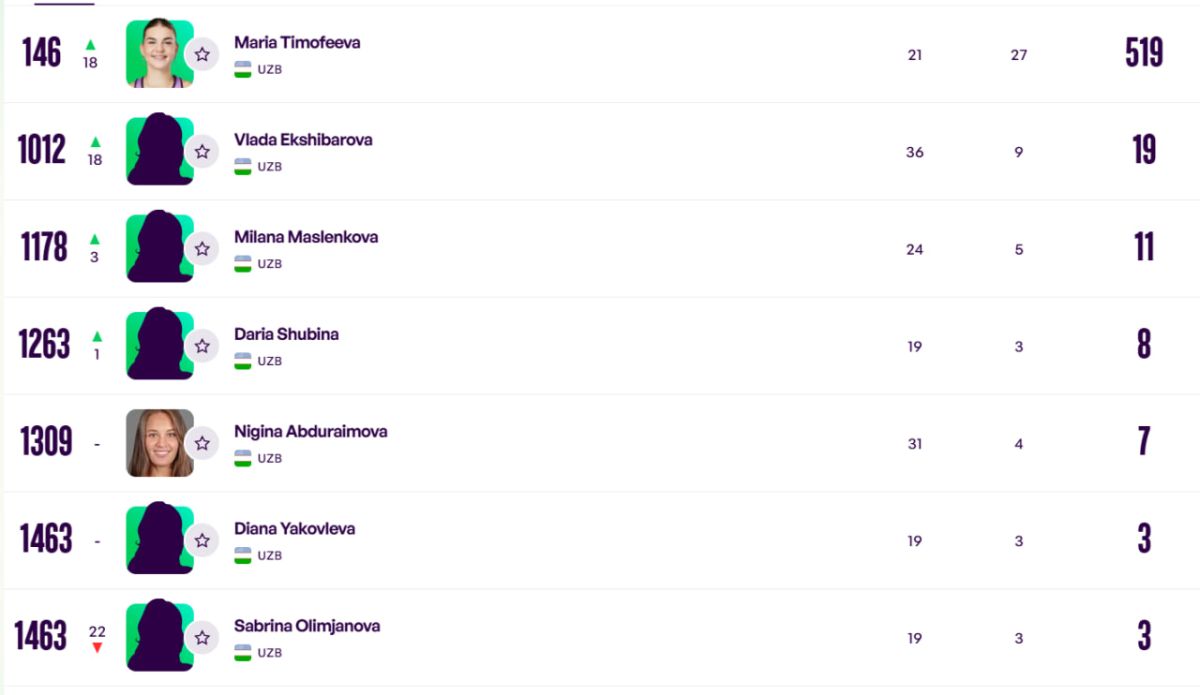 Эътиборлиси, Ўзбекистон фуқаролигини қабул қилган россиялик Мария Тимофеева расман мамлакатимизнинг биринчи ракеткасига айланди. У янгиланган WTA рейтингида 18 поғонага юқорилаб, 146-ўринда қайд этилди. У икки кун аввал якунига етган Португалиядаги W75 тоифасига кирувчи турнирда чемпион бўлганди. Иккинчи ракеткамиз Влада Якшибарова ҳам ўтган ҳафта билан таққослаганда 18 ўринга кўтарилган.